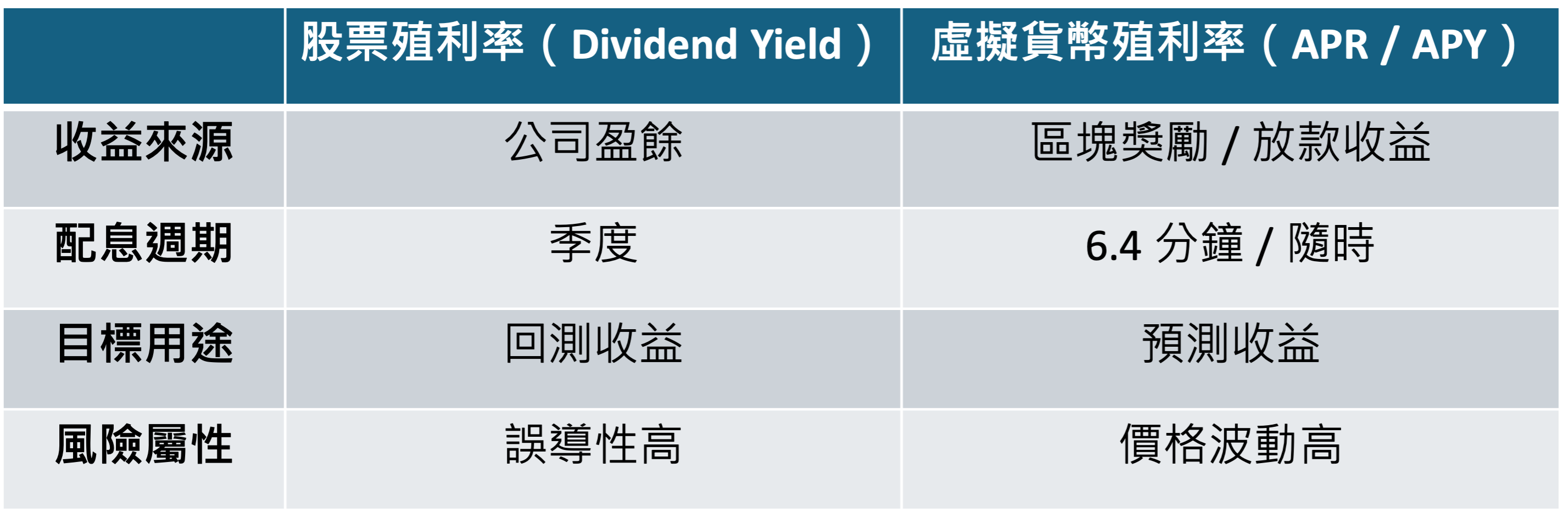 看到這裡,你可能會想,既然股票有殖利率,虛擬貨幣也有 APR 和 APY,兩者是不是其實一樣?答案是,概念相似,但本質不同,可從以下四點來區分👇