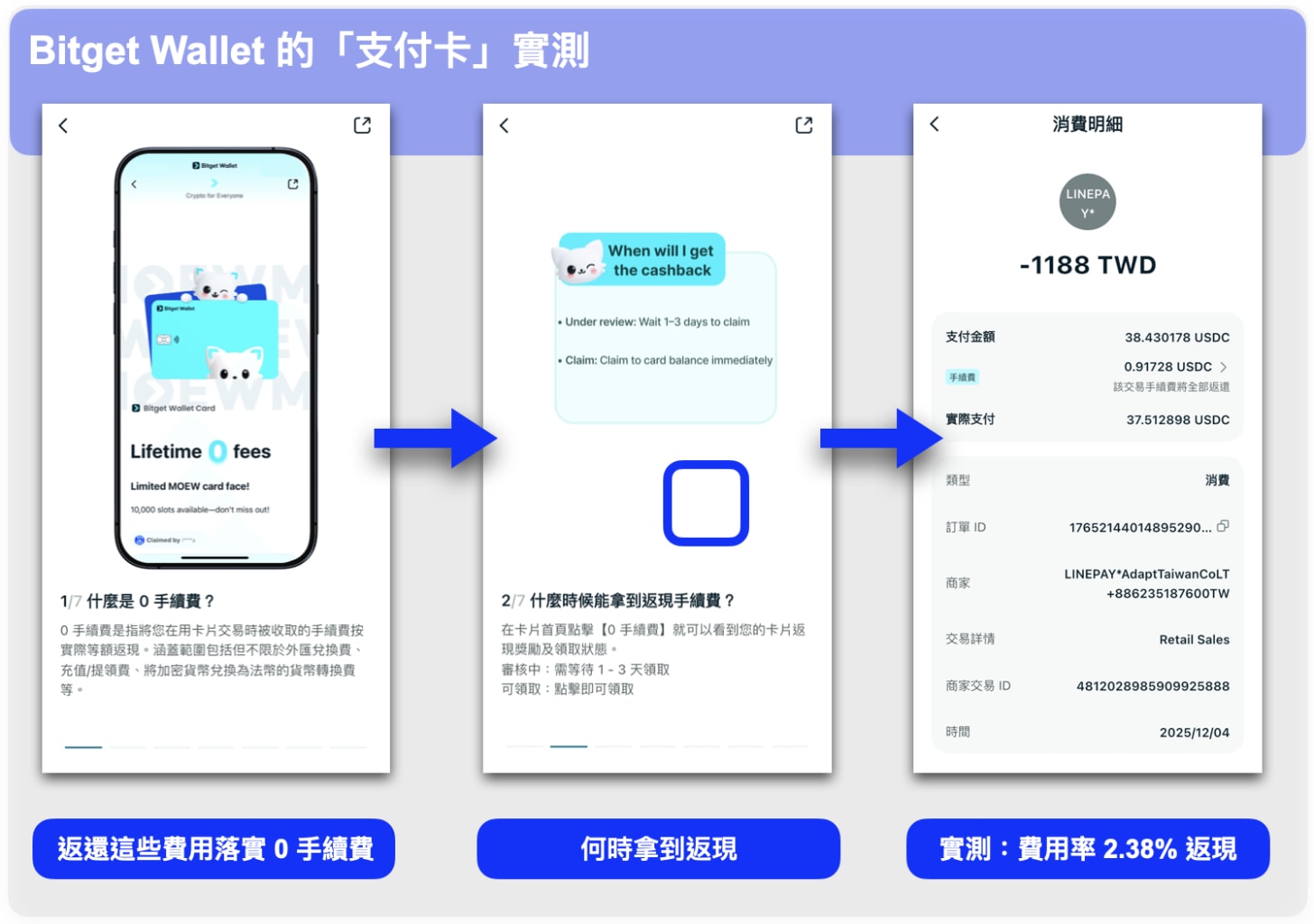 Leo 這邊也做了刷卡實測,數據顯示 Bitget Wallet 的費用率返現高達 2.38%(= 0.91728 / 38.430178),原來刷 U 卡的各式各樣費用真不容小覷。