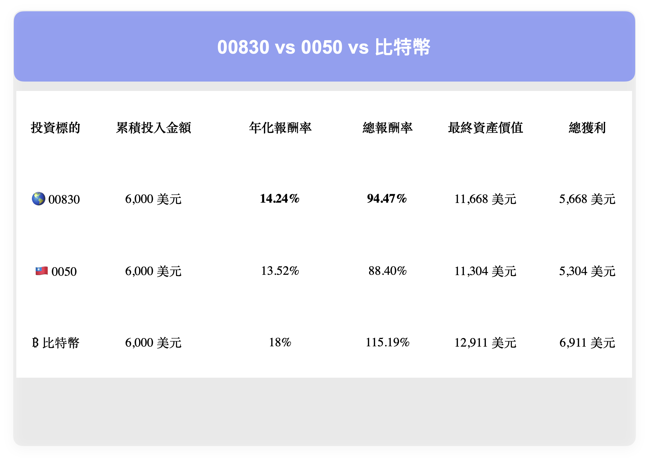 從定期定額結果來看,00830 在年化報酬率與最終資產價值上,雖落後於比特幣,但仍略高於 0050。顯示出 00830 即便歷經市場大型修正,分批投入能使長期績效維持在高水準。不過,00830 的報酬來源高度集中於單一產業,投資人仍需能承受較大的波動。