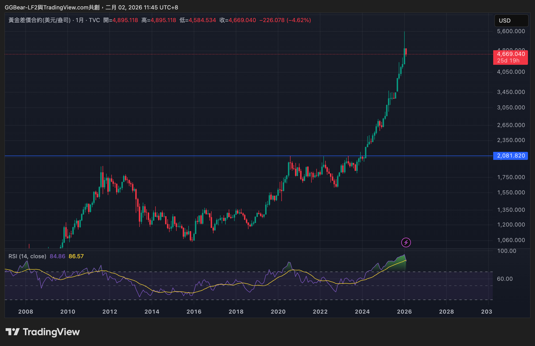 特別是這次金價行情在創下 5,598 美元新高後,RSI 並未繼續創高,反而出現動能減弱的跡象。技術動能鈍化,加上短線槓桿資金的獲利了結,成為第一波下跌的觸發點。