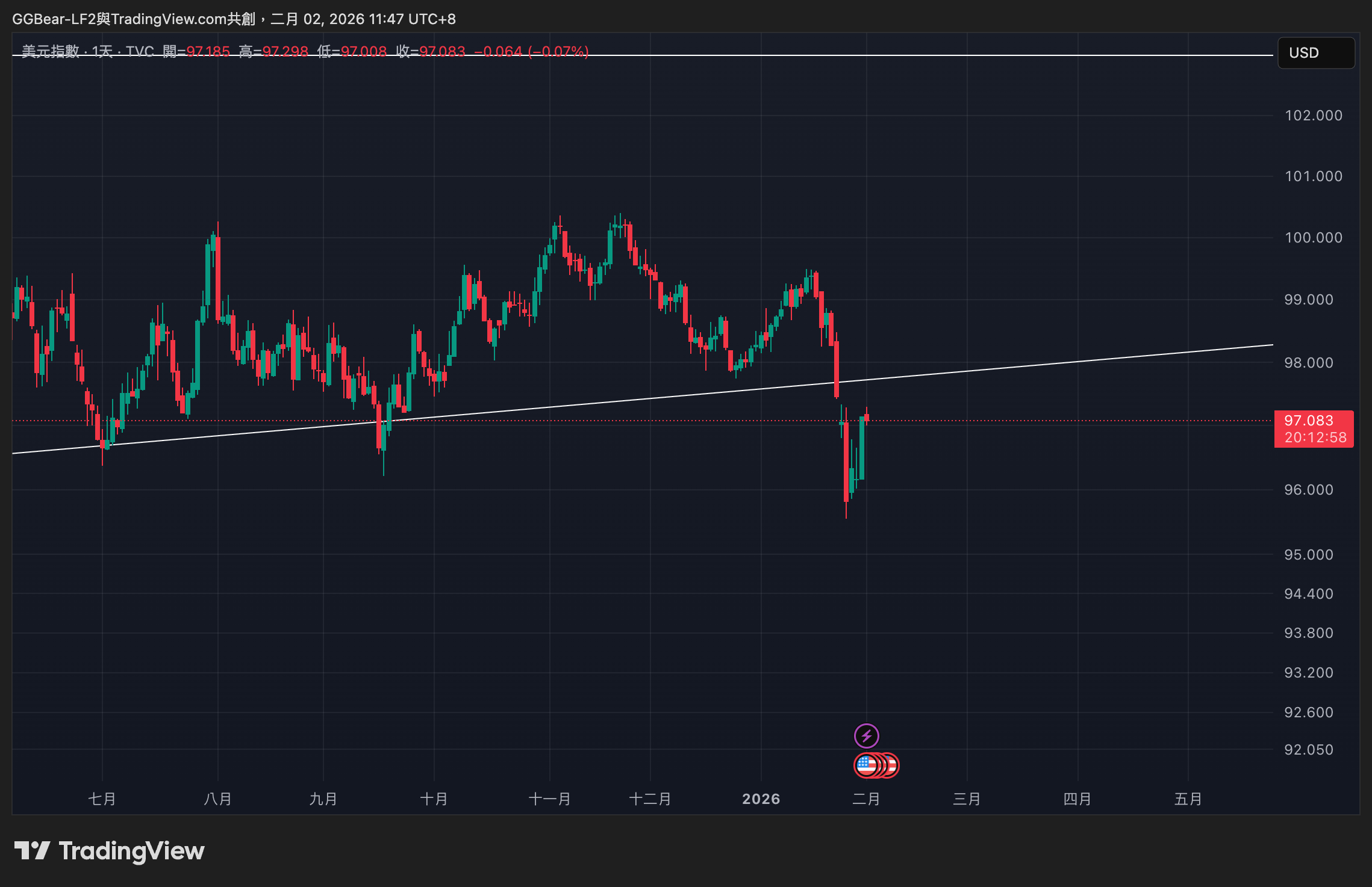 美元指數(DXY)日線圖則顯示,DXY 在跌破 96 後迅速反彈至 97 上方,出現明顯急拉走勢。