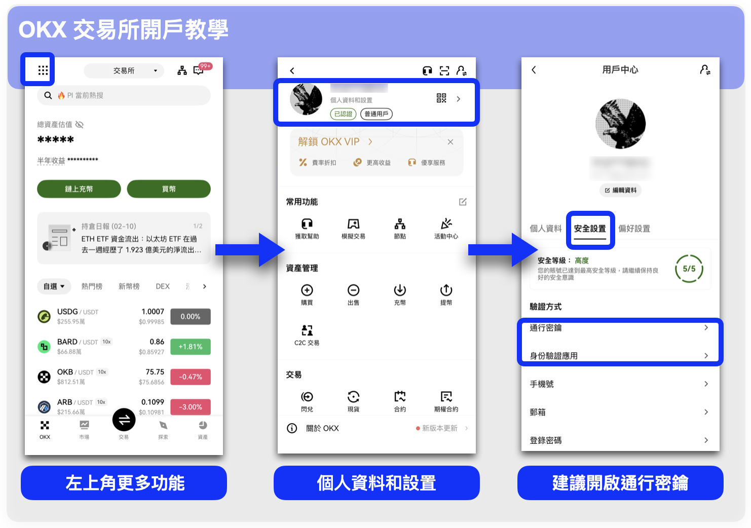 打開 OKX App 首頁 ⭢ 左上角更多功能 ⭢ 個人資料與設置 ⭢ 用戶中心 ⭢ 安全設置 ⭢ 通行密鑰。