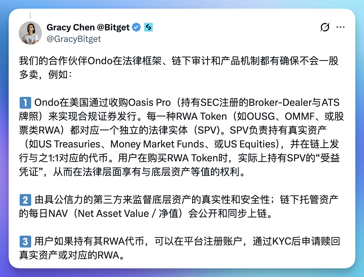 Bitget 目前主要支援 Ondo,Ondo 的優勢在於法律架構極度嚴謹,股息直接以 USDC 發放,非常契合交易所對資產安全與合規性的高要求。