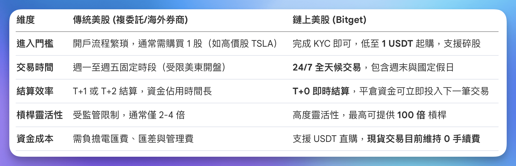而鏈上美股的出現,本質上是利用技術優勢對傳統經紀業務進行「效率降維」;它利用代幣化的「原生零碎化」特性,徹底粉碎了高價股的進入門檻。以下是 Bitget 鏈上美股與傳統券商的維度對比。