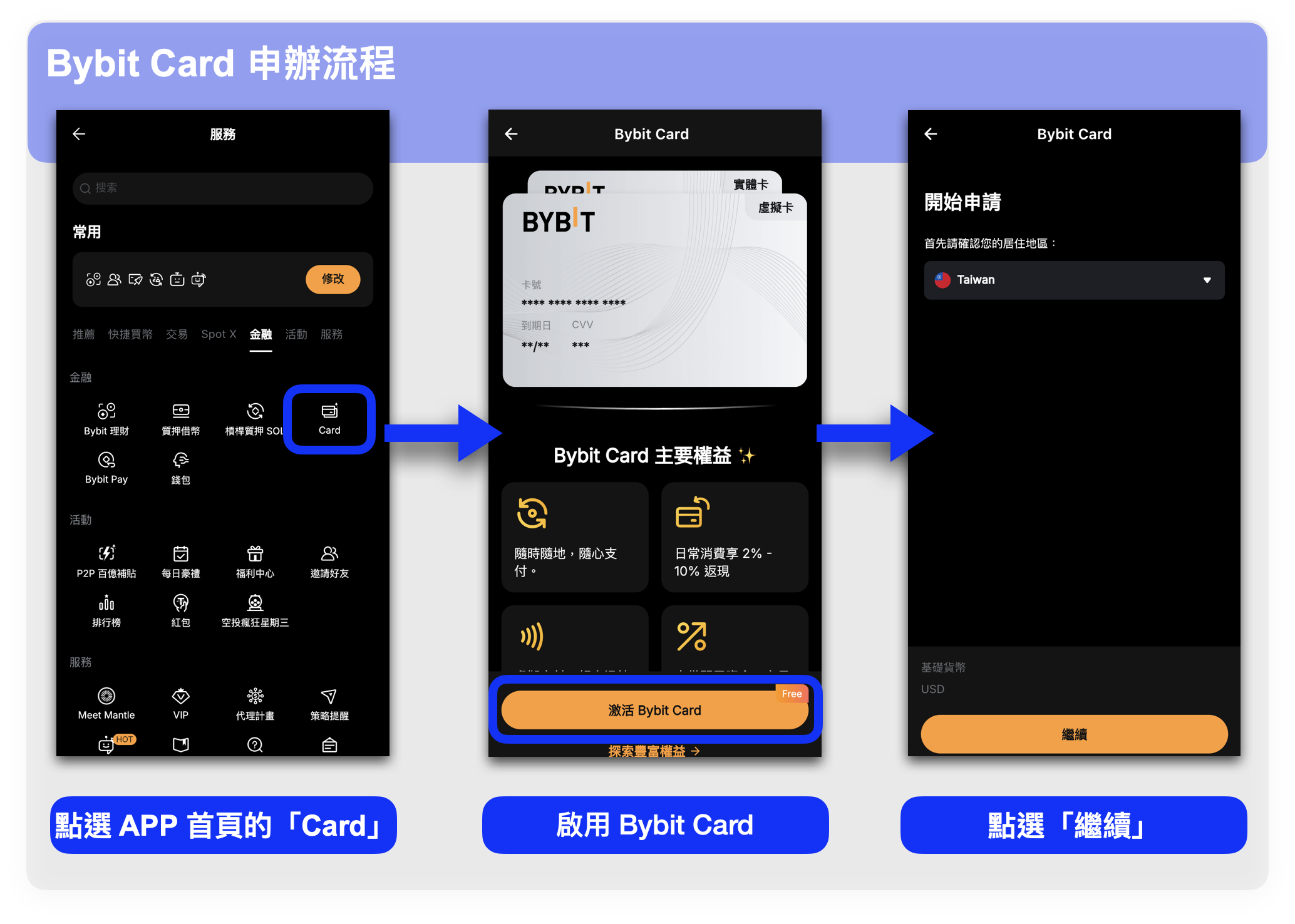 Bybit 辦卡非常快速,已具備 Bybit 身分認證的使用者只需在 APP 首頁點選「Card」按鍵,接著就是下一步和同意條款等等,幾乎不需要手動額外輸入其它資訊即可完成開卡,整個過程用不到一分鐘。