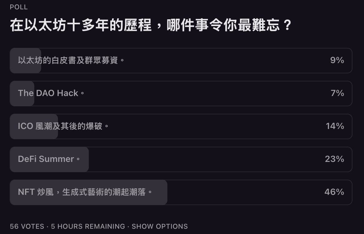 上期〈十年以太〉的民意調查,問到以太坊十多年歷史中最令人難忘的事件,56 位參與者中,近一半對 2021、22 年的 NFT 炒風印象最深,令事件以 46% 高票勝出,原因或許是 NFT 最為出圈,又或許是近期偏誤(recency bias)影響判斷,但最能反映以太坊社群核心價值的,卻非民意調查中得票最低的 The DAO Hack 莫屬。