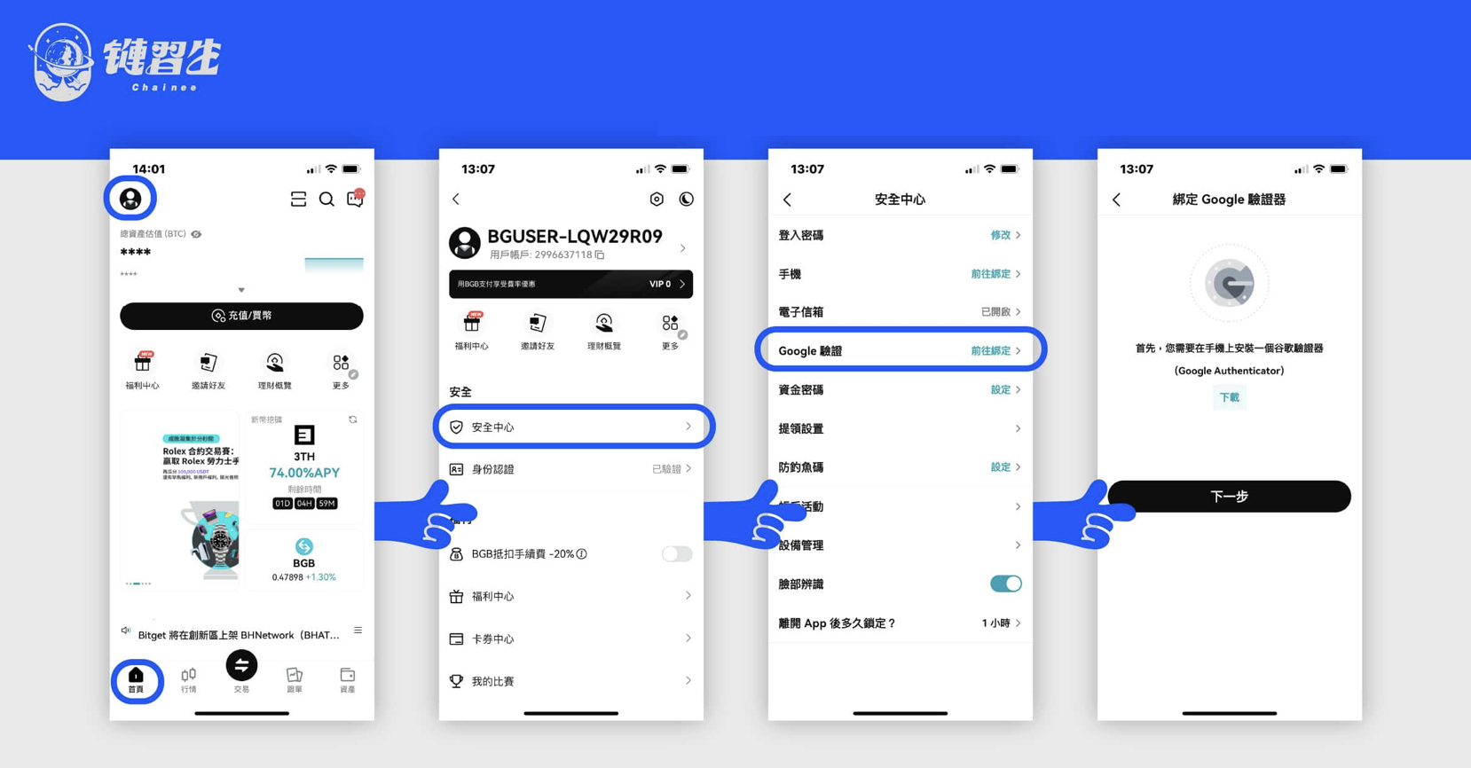 - 首頁左上角頭像 → 上方用戶流水號 → 安全中心 → Google 驗證