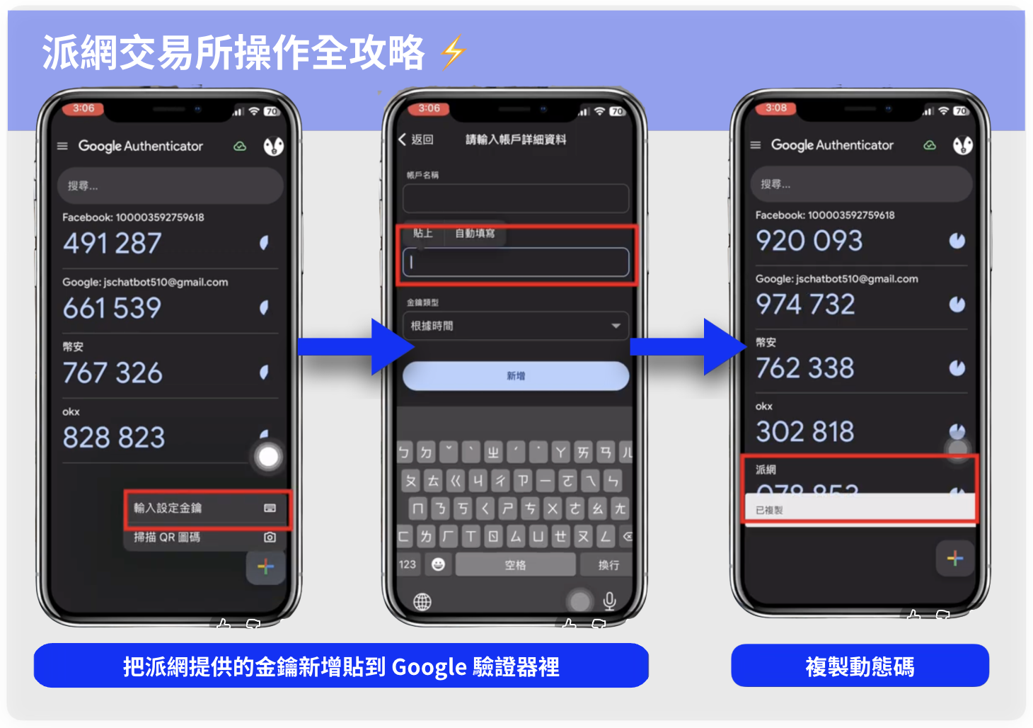 - 把派網提供的金鑰(Key) 新增貼到 Google 驗證器裡