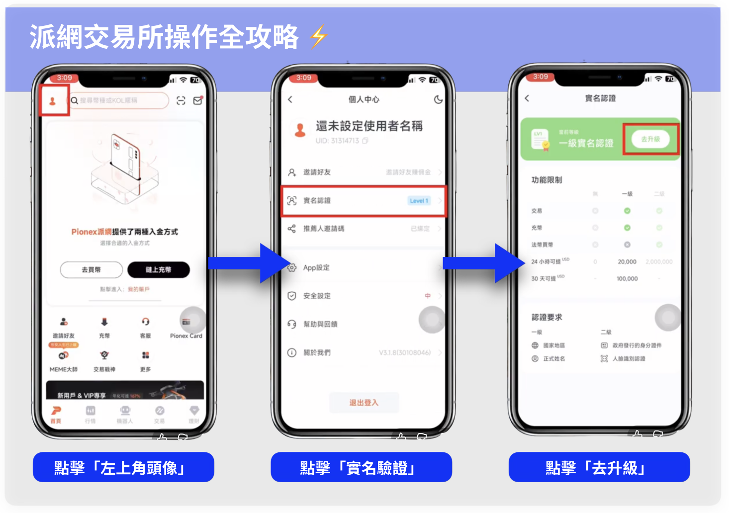 開戶流程也很直覺:註冊 → 開啟 2FA → 完成 KYC(LV2),通過後就能解鎖完整功能;入金方面如果想省成本,主流做法是先在本土所買 USDT 再用鏈上轉帳轉到派網;而信用卡買幣雖然方便,但通常會有匯率與刷卡成本,整體費用相對高。