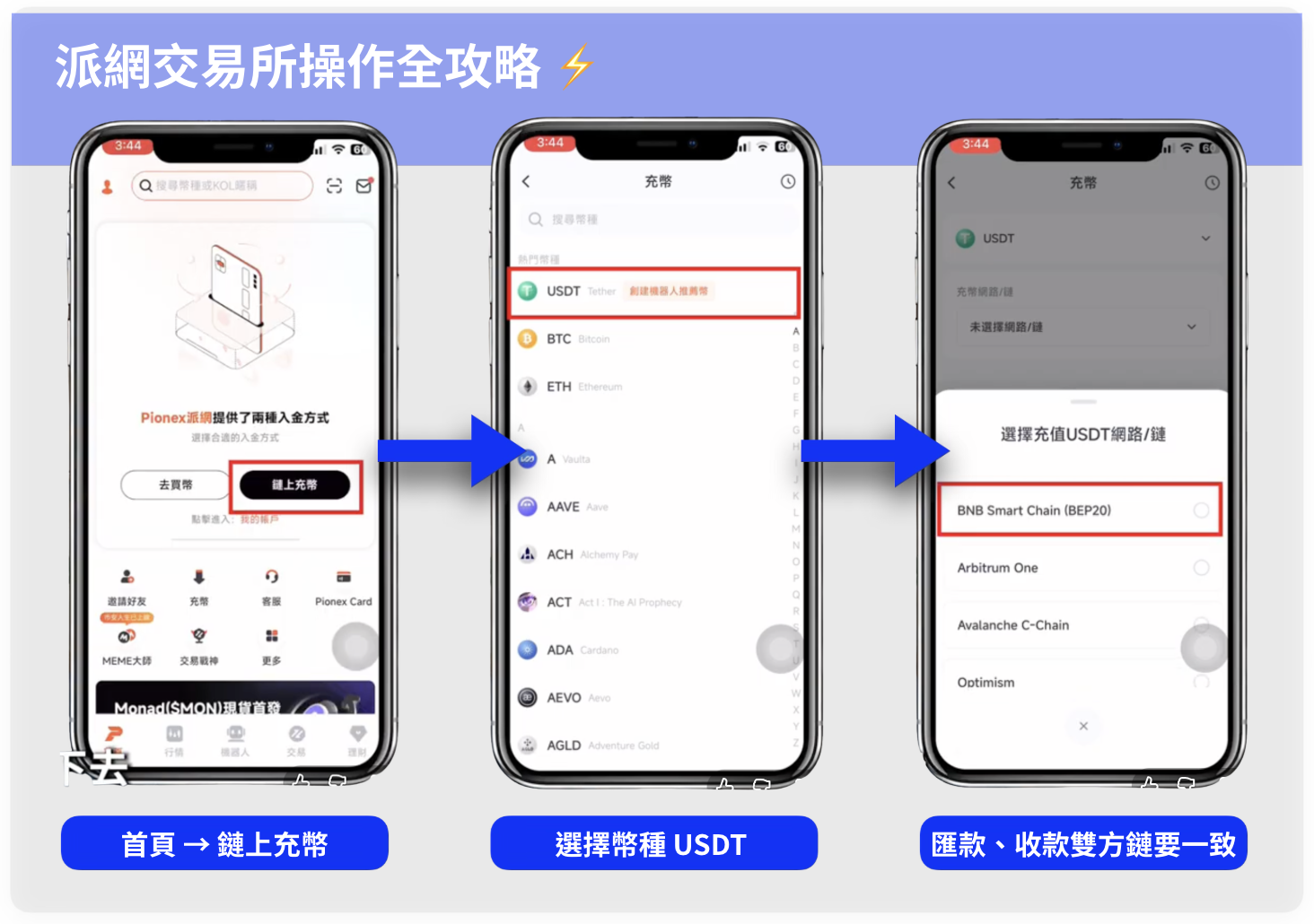 - 派網:首頁「+」號 → 鏈上充幣 → 選 USDT → 選 BEP20 → 複製充幣地址