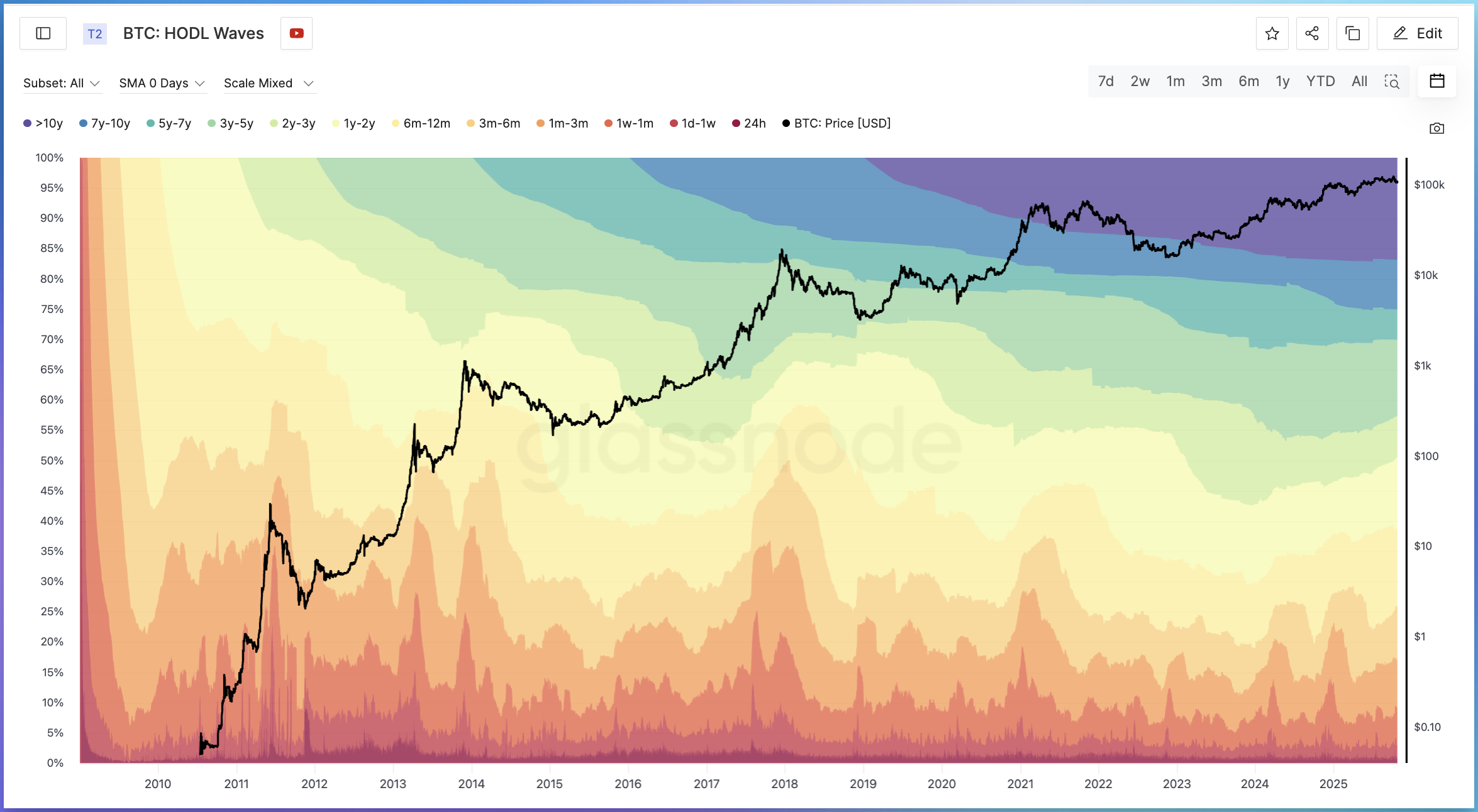 比特幣 HODL Waves(持有幣齡波浪)是一種觀察大家持幣時間的鏈上數據,你的比特幣多久沒移動了?