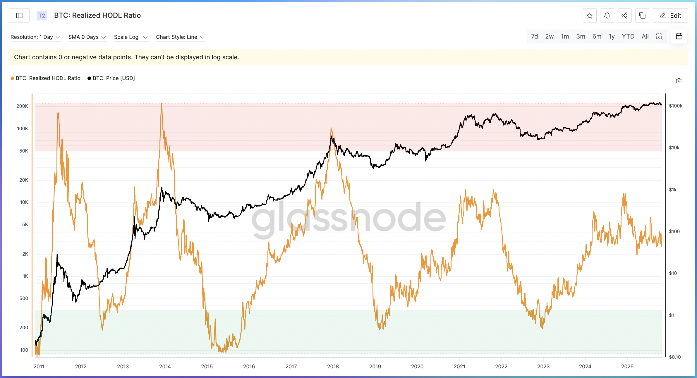 在實際觀察中,RHODL 比率的高點幾乎都對應牛市頂部,而且每一輪循環的高點都呈現 lower high,這也呼應比特幣長期的 diminishing returns(報酬遞減現象)趨勢。