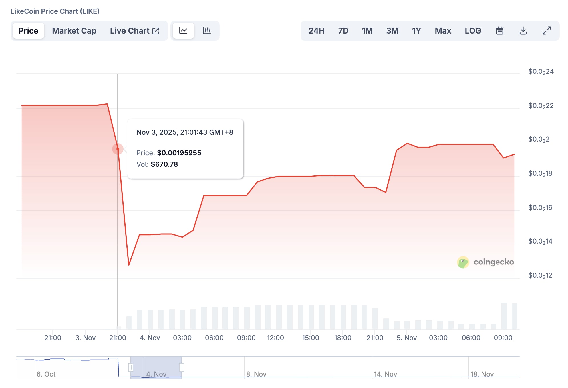 安樂茶飯吃不到半頓,一看手機,驚覺 LikeCoin 的幣價已經掉了一半。一邊三扒兩撥把麵吃完,一邊了解情況: