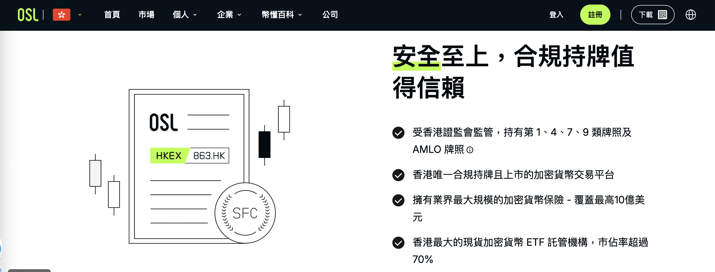 OSL 是香港唯一同時有上市公司背景、又拿到 SFC 監管牌照的加密貨幣交易所,而且還由四大會計師事務所定期審計,財務跟營運都公開透明。這樣的合規程度,遠遠超過像幣安、OKX 這類還沒拿牌的國際平台,也讓用戶在交易和資產保護上更有法律保障。