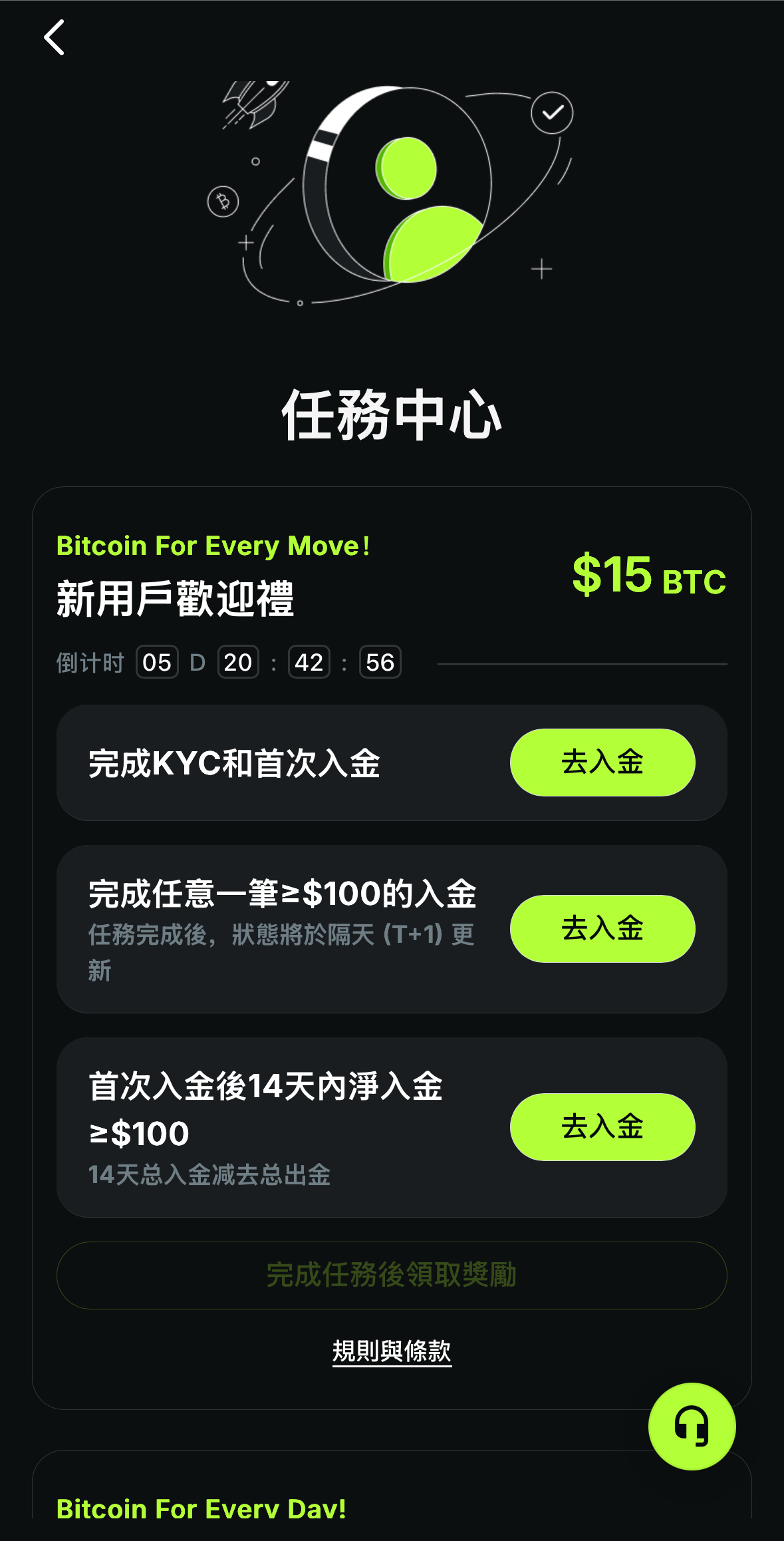 邀請好友註冊,若好友完成 KYC 並於註冊後14天入金 100U 以上,邀請者與被邀請者將各自獲得 10 U 等值 BTC 獎勵,活動詳情。
