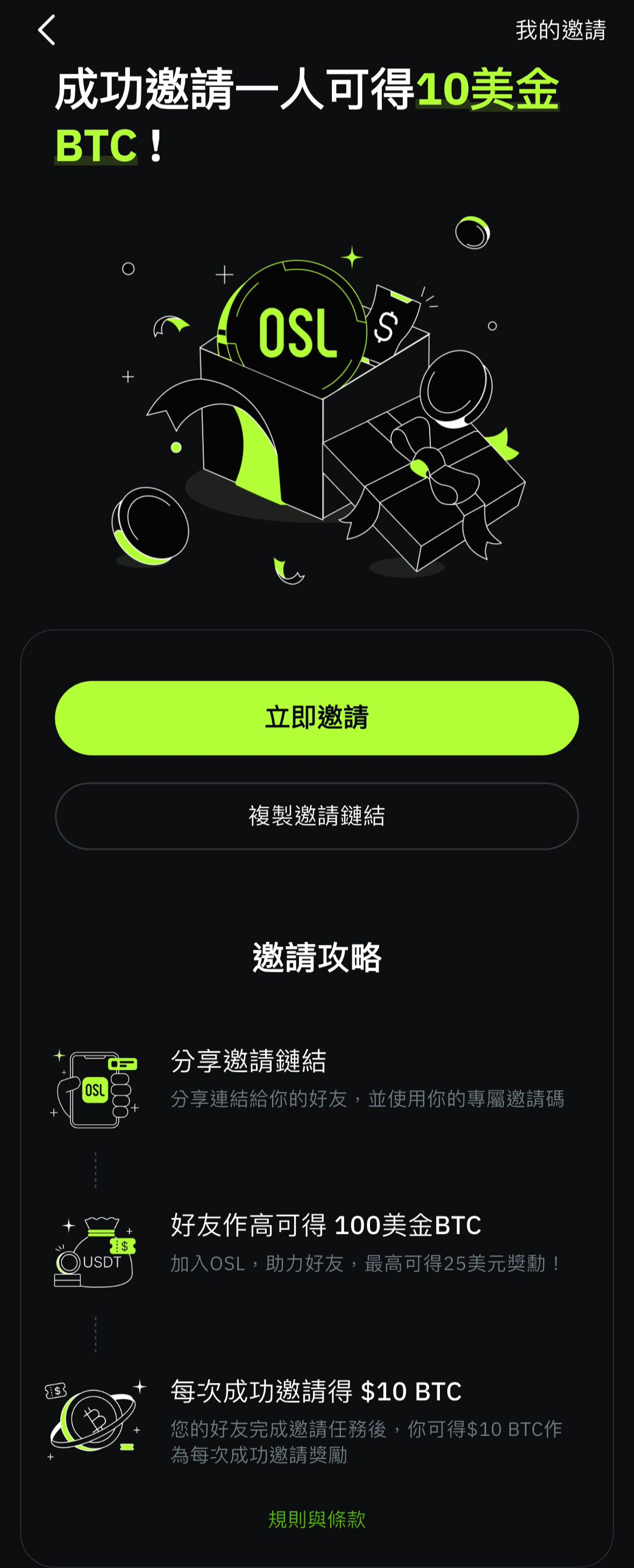 OSL 也針對一般用戶設計了新手友善的任務活動。只要透過鏈習生專屬連結註冊,完成 KYC 後入金 100U 並放滿 14 天(或者入金 100U 以上,交易滿 10U)),就能直接拿到 25U 等值的 BTC,還可以透過好友邀請額外累積獎勵。