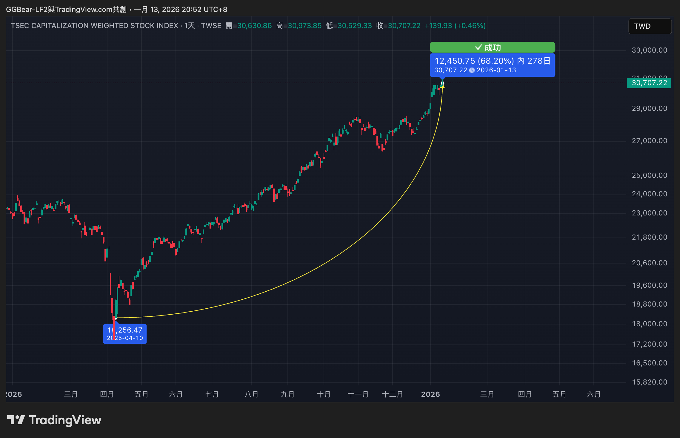 截至 1 月 13 日,台股加權指數收在 30,707 點,相較於國安基金進場前的 18,256 點,累計漲幅高達 68%。不僅如此,台股總市值也從 2025 年底的 94.36 兆元,一路攀升至 99.6兆元,直逼百兆大關,超越法國成為全球市值第 7 大股市。