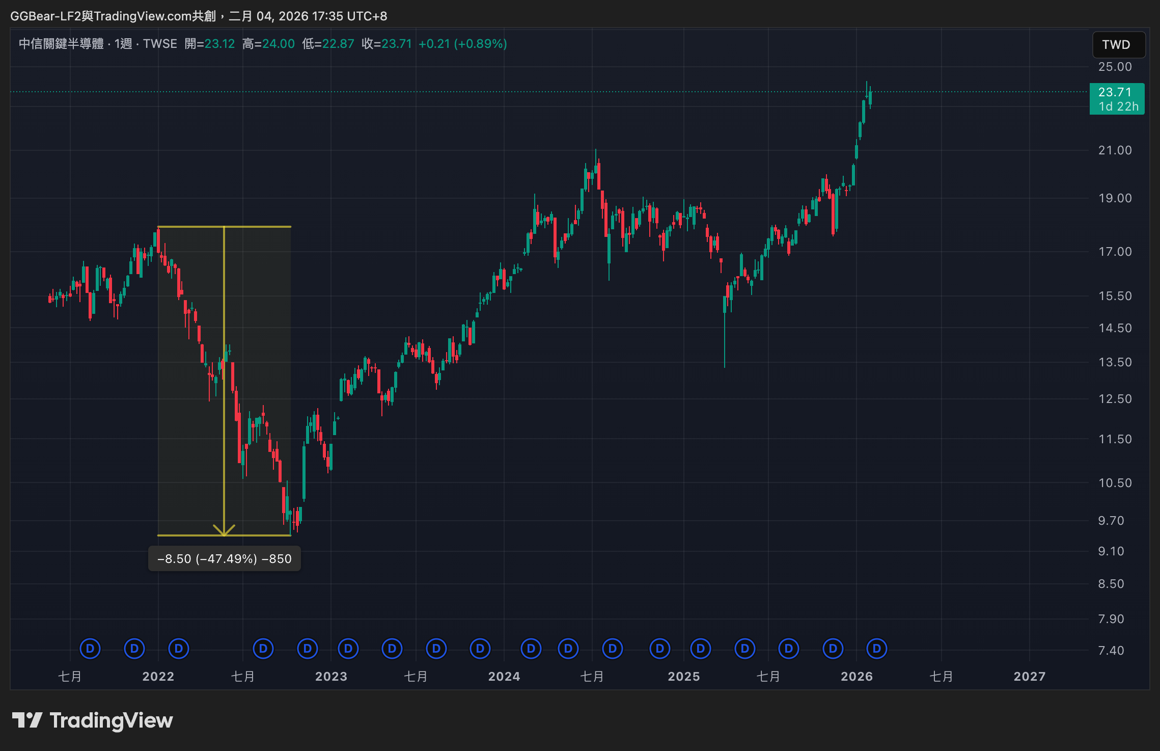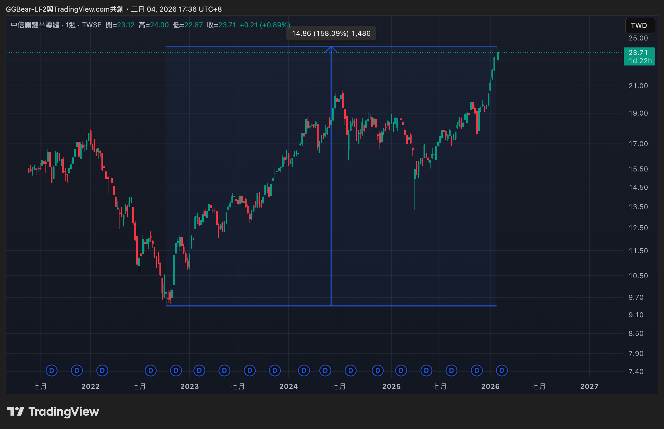 從歷史走勢來看,00891 自 2022 年 10 月低點 9.40 元起漲至 2026 年 1 月的歷史新高 24.26 元,最大漲幅逾 158%,展現出優異的資本利得表現。這種「高配息 + 高成長」的特性,讓 00891 從眾多 ETF 中脫穎而出。