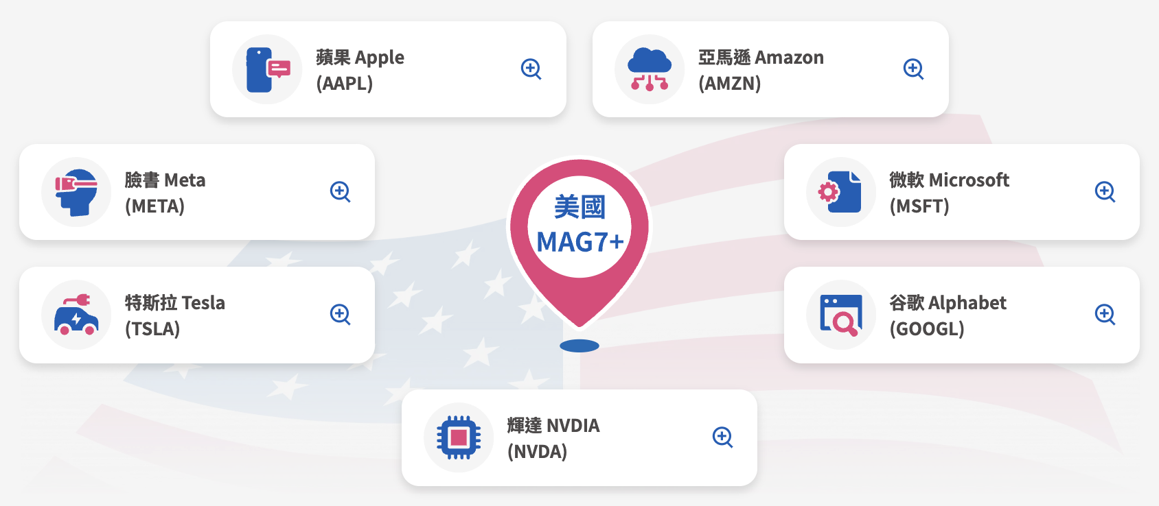 所謂的七巨頭(Magnificent 7),意指蘋果(Apple)、亞馬遜(Amazon)、臉書(Meta)、微軟(Microsoft)、特斯拉(Tesla)、Google 母公司 Alphabet 以及輝達(NVIDIA)等七大科技巨擘。