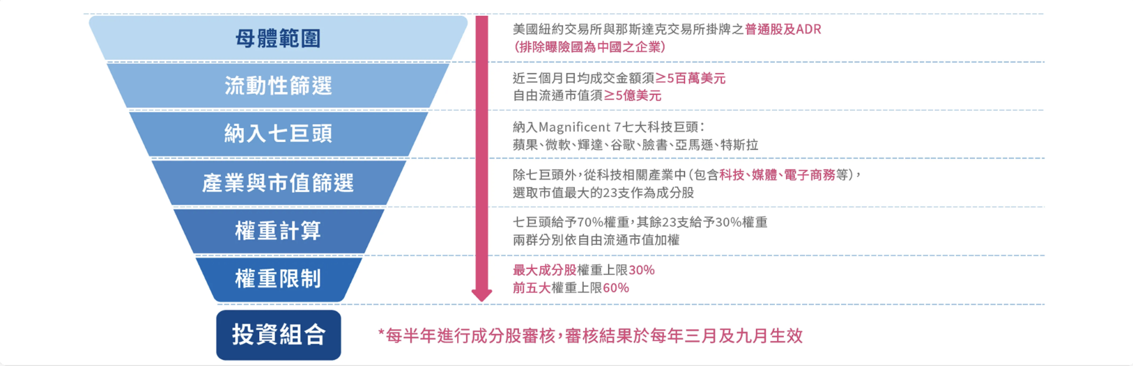 009815 追蹤的彭博 TPEx Magnificent 7 Plus 指數採用「漏斗式篩選」策略,層層把關最具投資價值的成分股。