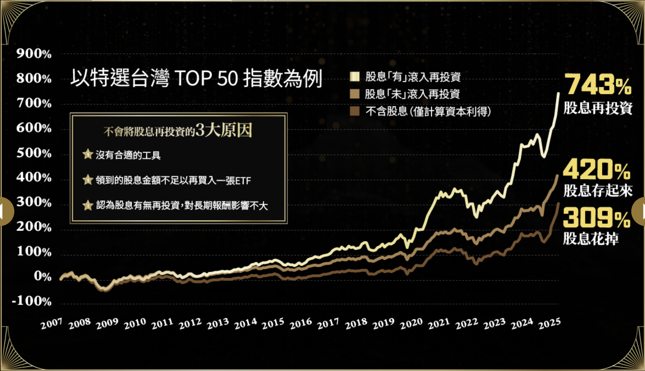 根據凱基投信以「特選臺灣 TOP 50指數」為例的回測數據,從 2007 年到 2025 年,009816 這類「股息再投資」策略的累積報酬率高達 743%,遠超「股息換現金」(420%)、「股息花掉」(309%)等兩種收益模式👇