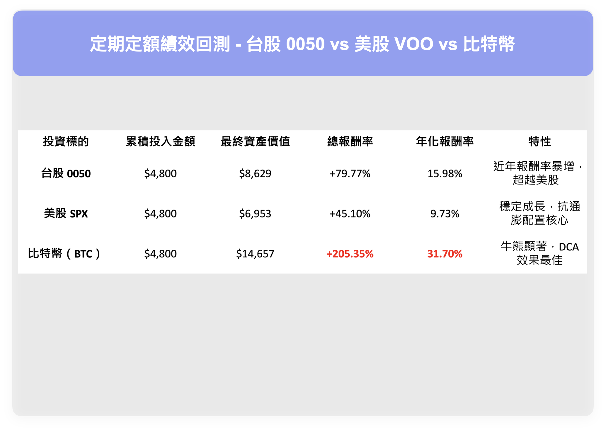 無論你選擇哪一種資產,DCA 的核心價值始終都在「時間 × 紀律」。畢竟能 VOO 給你全球經濟的平均報酬;0050 讓你參與台灣企業成長;比特幣則提供數位稀缺資產的長期紅利。可以見得,只要是成長型資產,都存在長期投資價值。