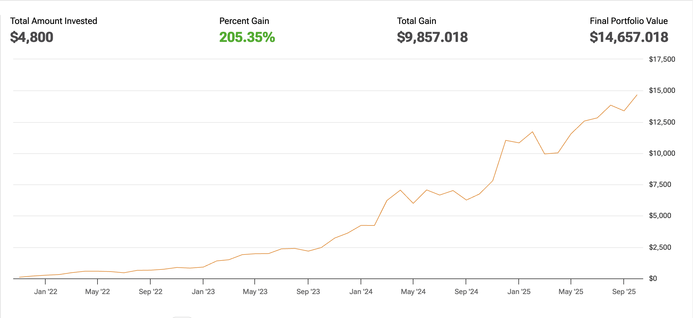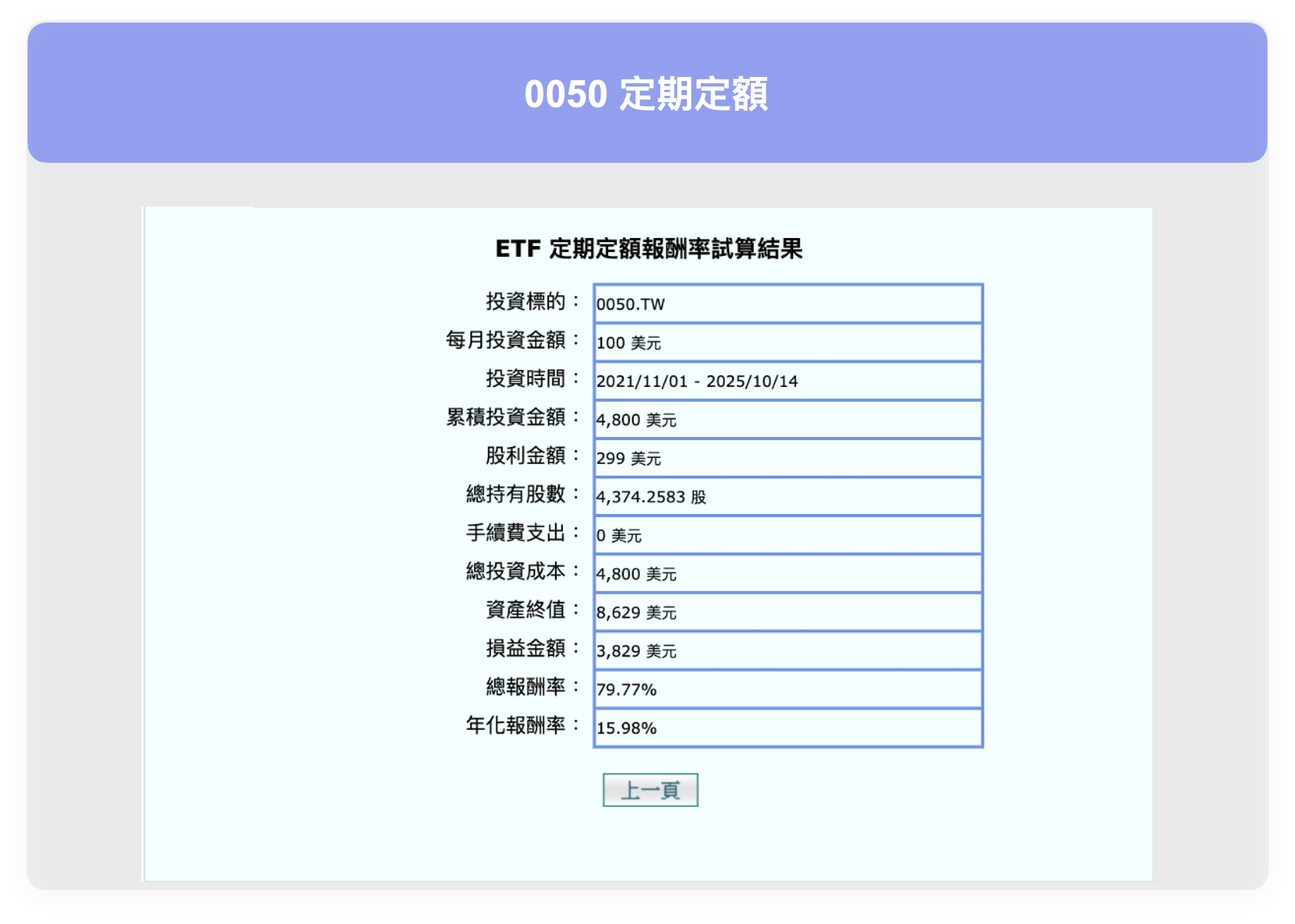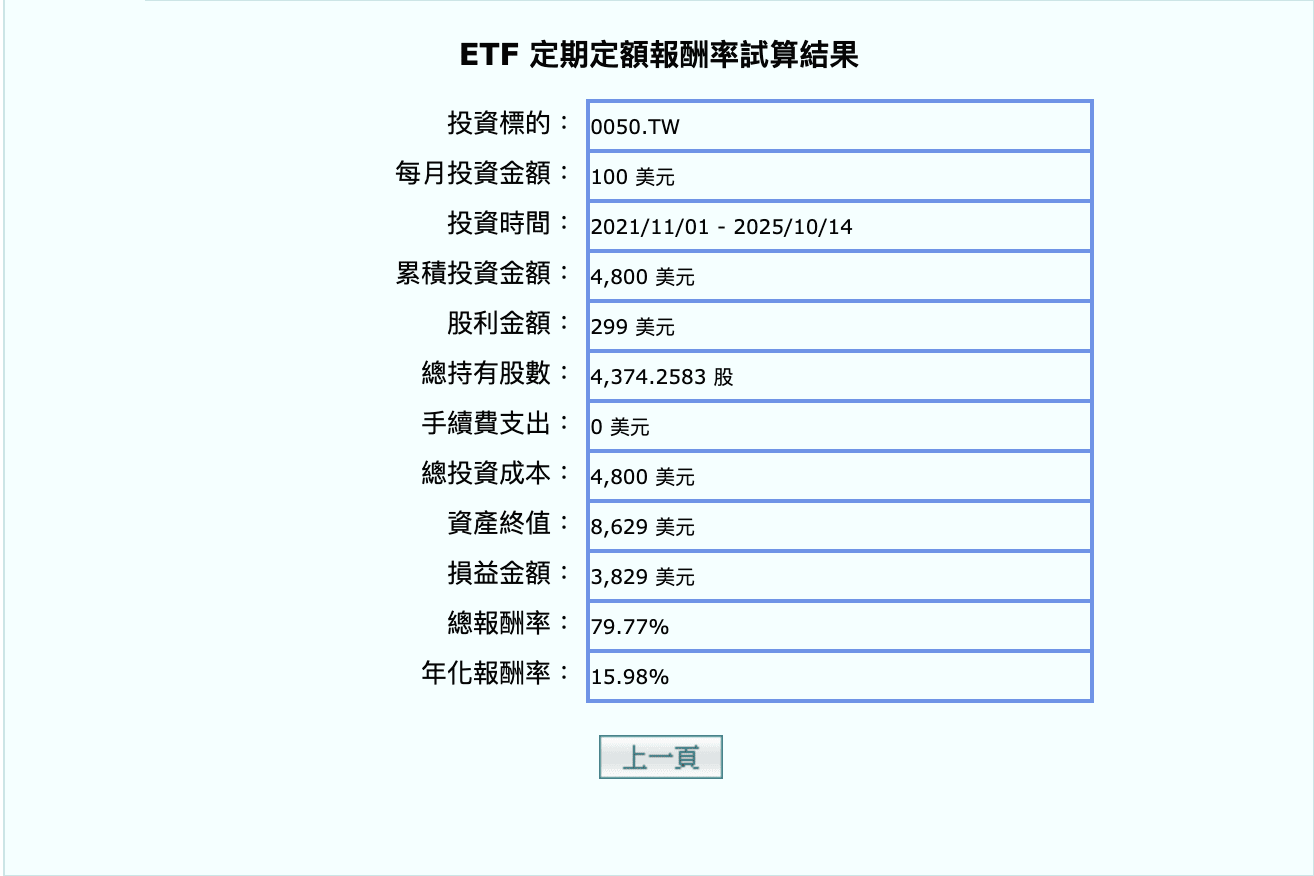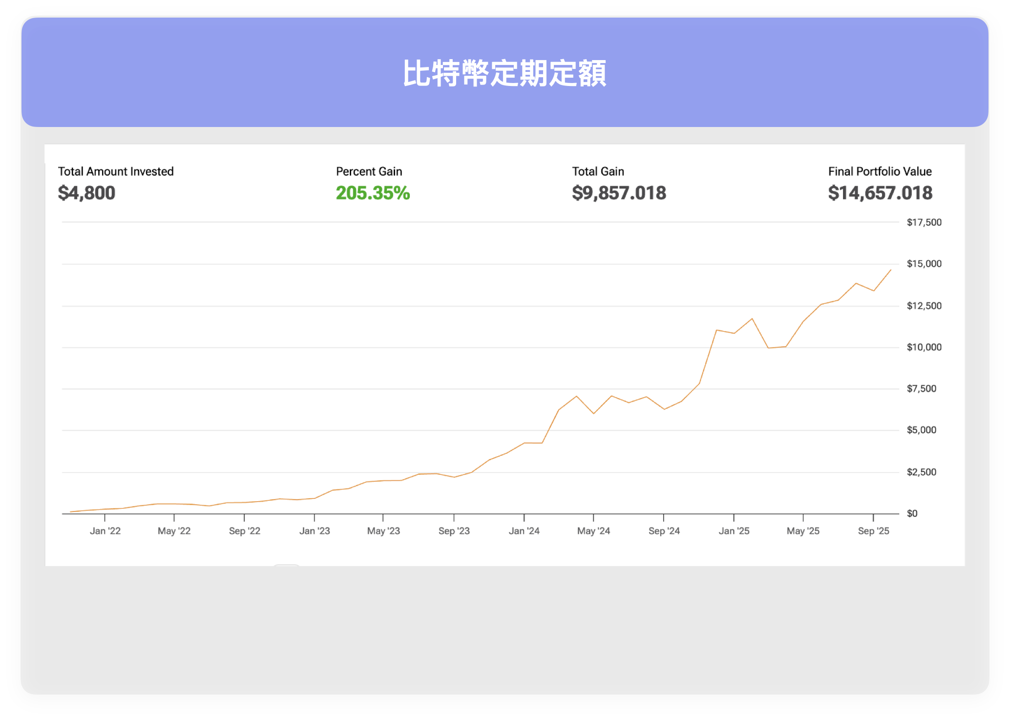 為了讓比較更具代表性,我們以最近一輪比特幣牛市頂部 2021 年 11 月,也就是比特幣最弱勢的時間點作為共同起點,模擬每月投入 100 美元(3,000 台幣)、持續投入至 2025 年 10 月(共 48 期)的定期定額結果。以下是三者的實測表現: