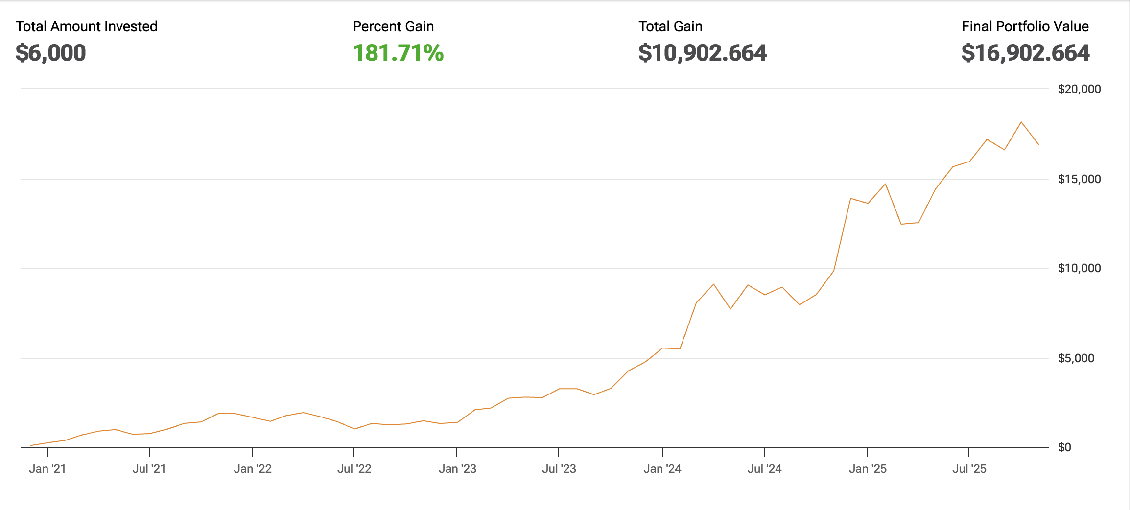 比特幣作為加密貨幣第一大權值幣,其定期定額績效亦不亞於台積電,於五年內實現 +181.71% 總報酬率,年化報酬率達 42.86%。這說明比特幣的高波動性反而得以讓投資人在低點位處累積到更多部位,進一步在牛市循環啟動後迎來投資組合的爆發式成長。