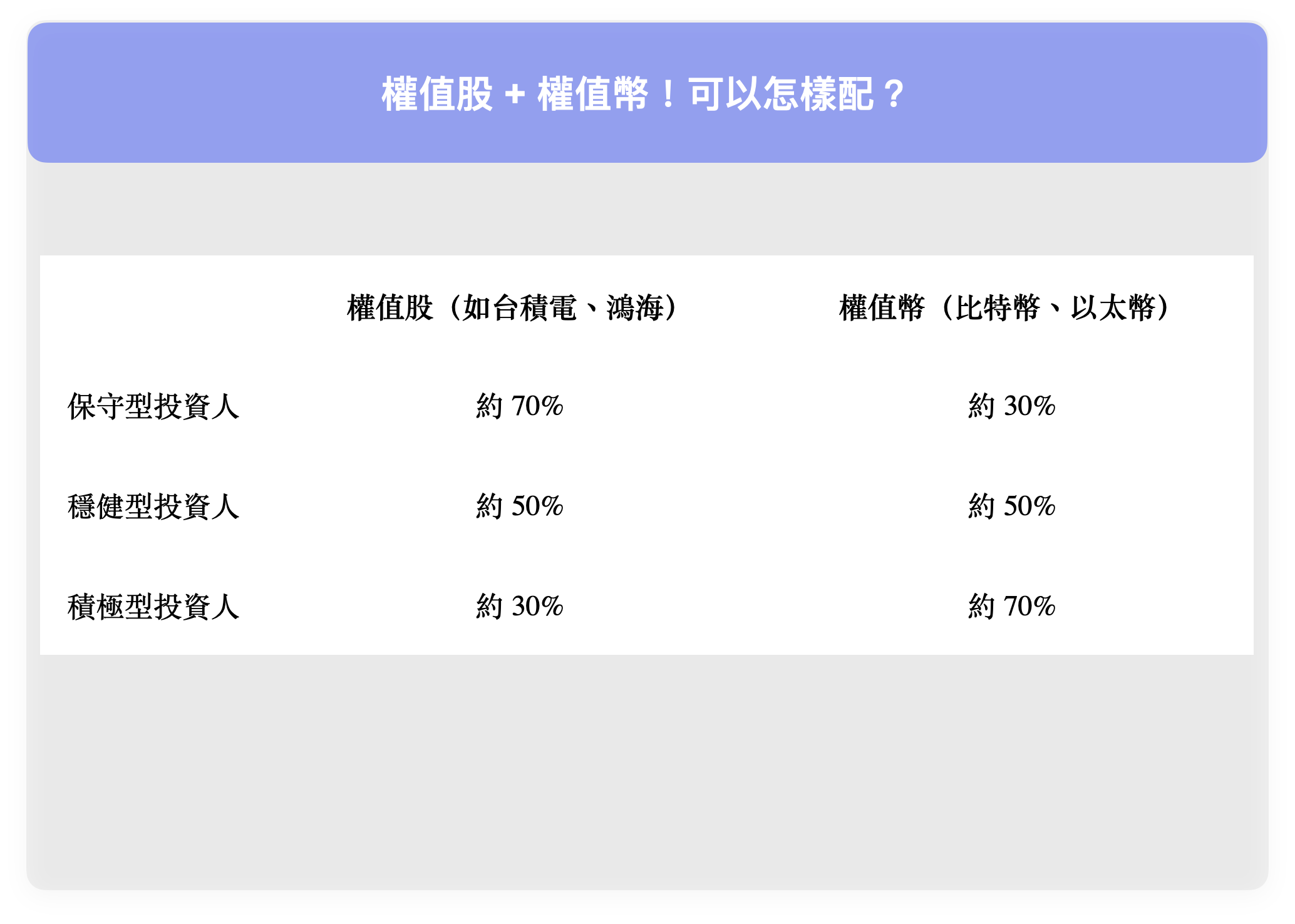 事實上,部分投資人會採用「兩種都配置」的投資組合,透過不同比重的搭配,來因應各自的風險屬性,以下為一個示意性的「權值股 + 權值幣」配置參考表,你可以依照自身狀況進行微調👇