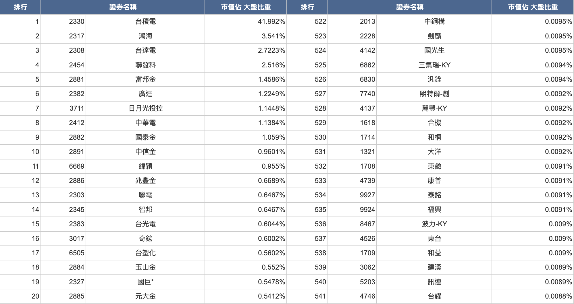 假如你想進一步認識更多權值股,亦可直接參考「台灣期貨交易所」整理的市值比重表。該表列出了台股所有成分股在大盤中所佔有的比,能讓你快速判斷哪些上市公司對台股加權指數的影響較大👇