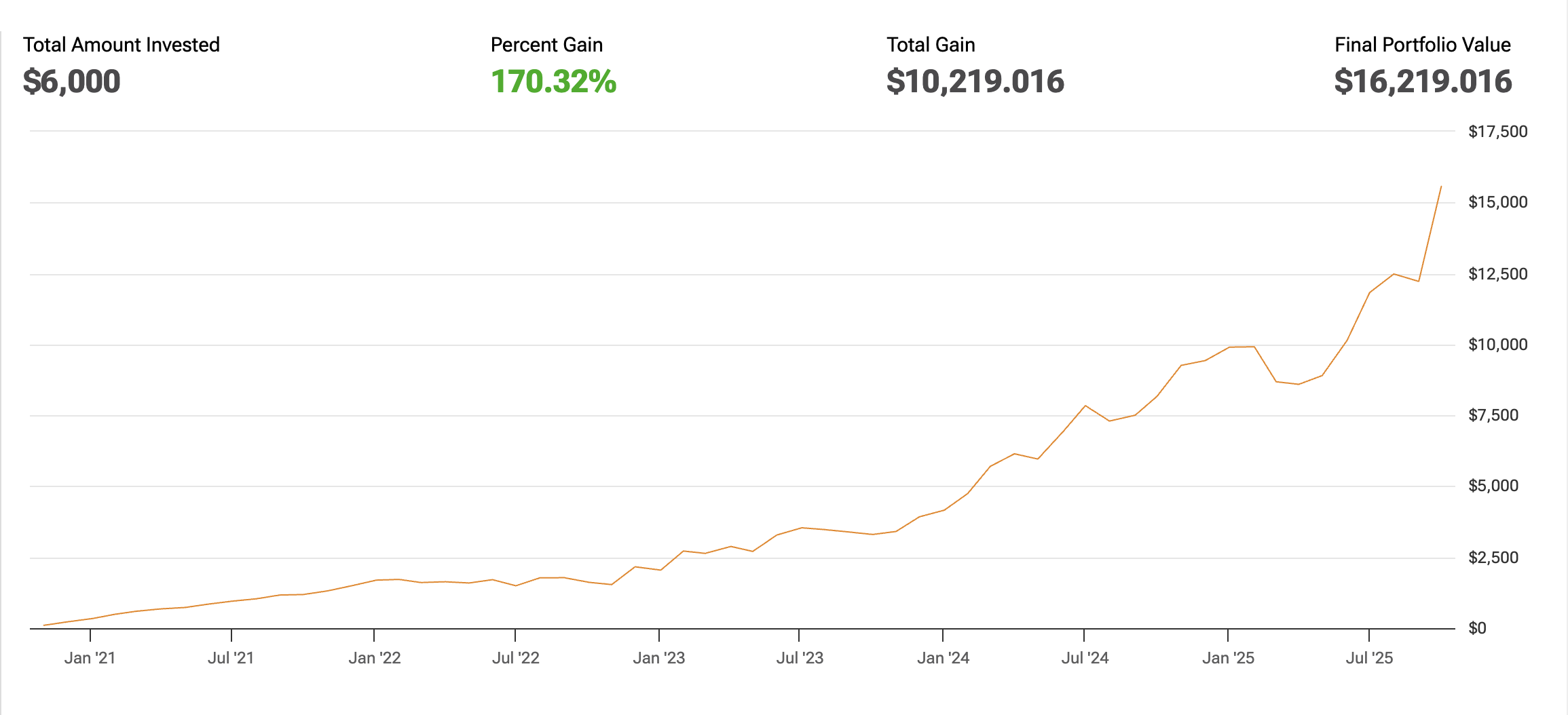 那麼現在就直接來看看「權值股 vs 權值幣」在過去五年內,每個月定期定額(DCA) 100 美元的績效表現吧!