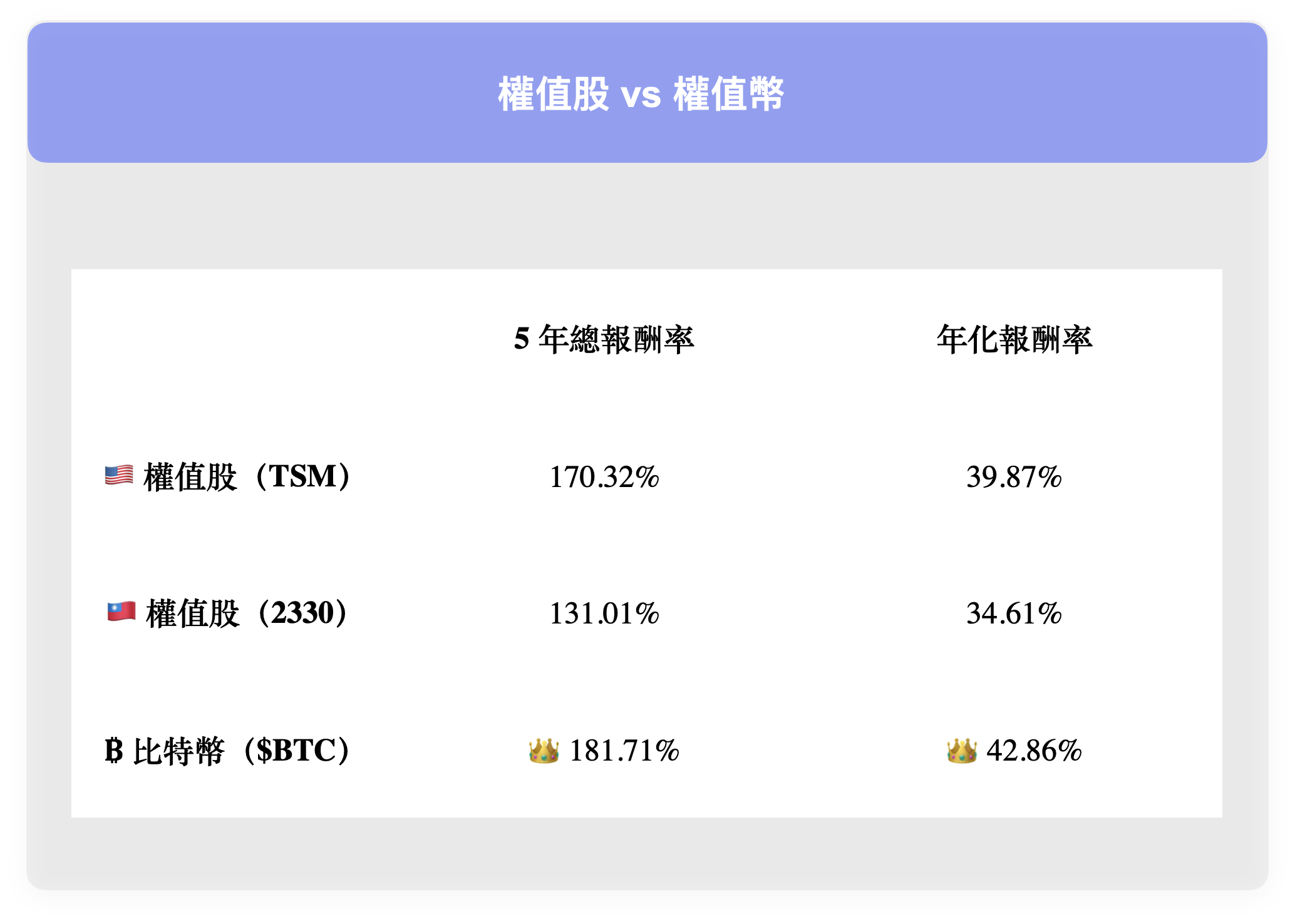 除了股票市場有權值股,加密市場也有「權值幣」,而五年定期定額績效顯示,比特幣甚至比台積電更強,兩者都能成為投資組合中的重要配置。