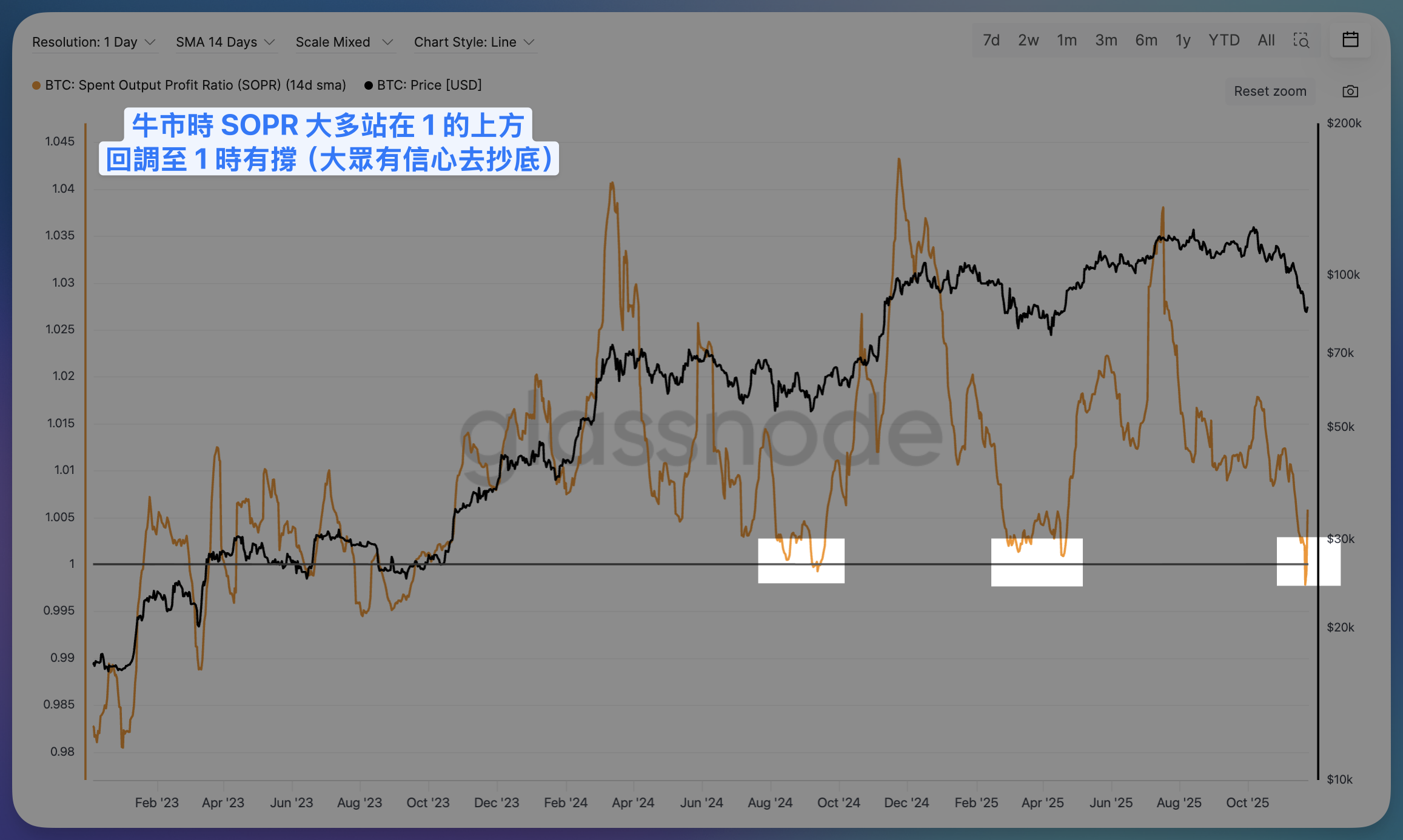 在牛市階段(圖中為 2023/1~2025/11),SOPR 最典型的特徵,就是大多時間站在 1 的上方。